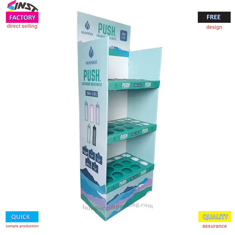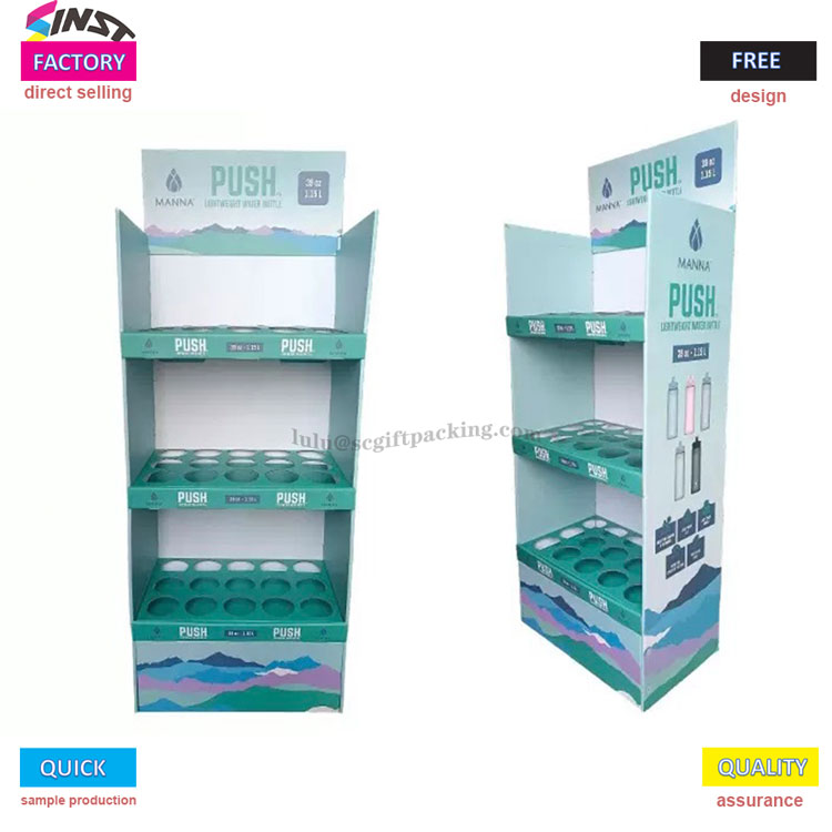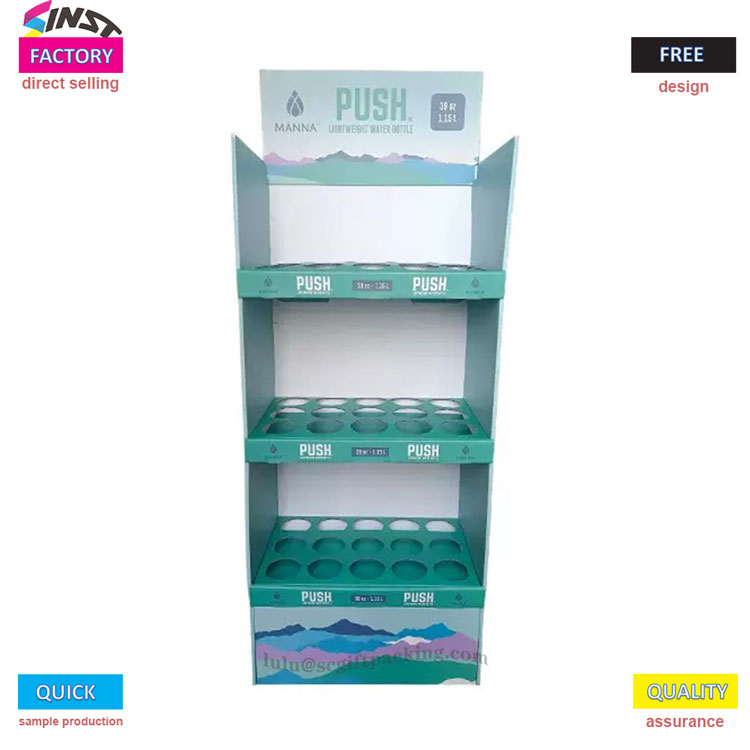การแสดงพื้นกล่องกระดาษแข็งนี้สำหรับขวดน้ำ Supermarke มีการออกแบบโครงสร้างกริดสามชั้นพร้อมร่องวงกลมในแต่ละชั้นเพื่อยึดขวดน้ำไว้อย่างแม่นยำและป้องกันการกลิ้ง โลโก้แบรนด์สามารถพิมพ์ได้ที่ด้านบนและสามารถพิมพ์กราฟิกผลิตภัณฑ์ที่ด้านข้างเรียบง่ายและสูง ส่วนใหญ่ใช้สำหรับการแสดงผลิตภัณฑ์เช่นขวดน้ำ, ถ้วย, ถ้วยชานม, ถ้วยเทอร์โมส ฯลฯ