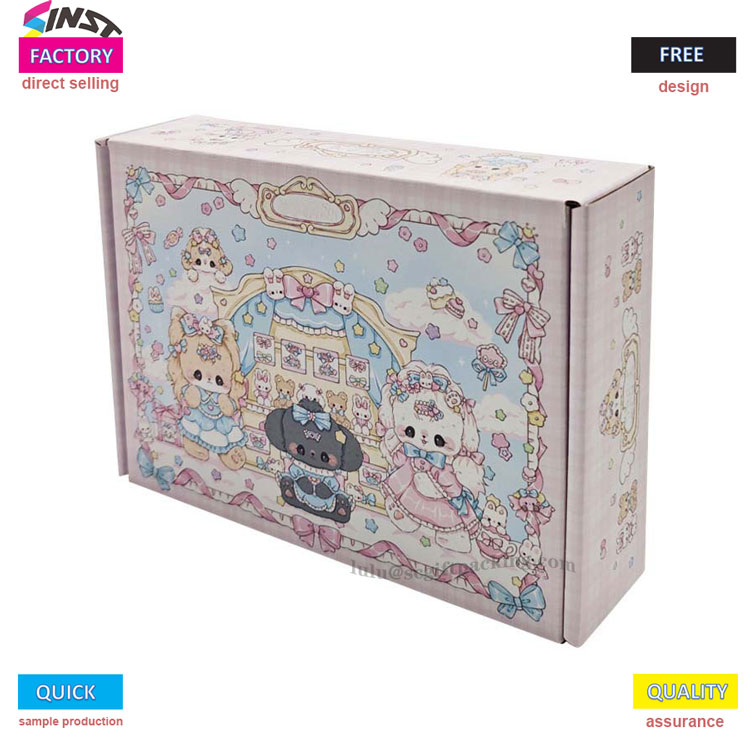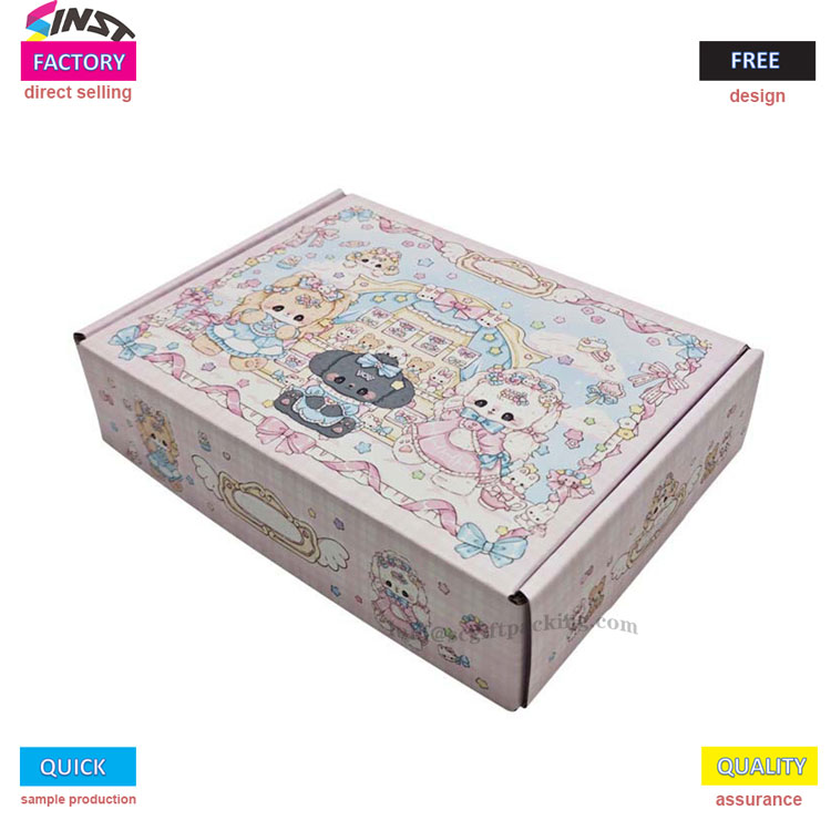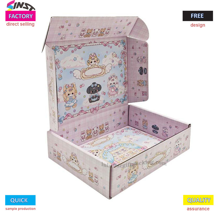 กล่องเครื่องบินกระดาษลูกฟูกที่มีสีสันสำหรับเสื้อผ้ามีโทนสีชมพูหวานพร้อมสำเนียงสีฟ้าอ่อน กล่องเต็มไปด้วยองค์ประกอบการ์ตูนเช่นพวงมาลัยดอกไม้สัตว์เล็กคันธนูเมฆและหัวใจสร้างสไตล์ที่ฝันและน่ารัก จากรูปลักษณ์ไปจนถึงการบริการมันให้อำนาจบรรจุภัณฑ์เสื้อผ้าอย่างเต็มที่และเพิ่มความน่าดึงดูดของแบรนด์